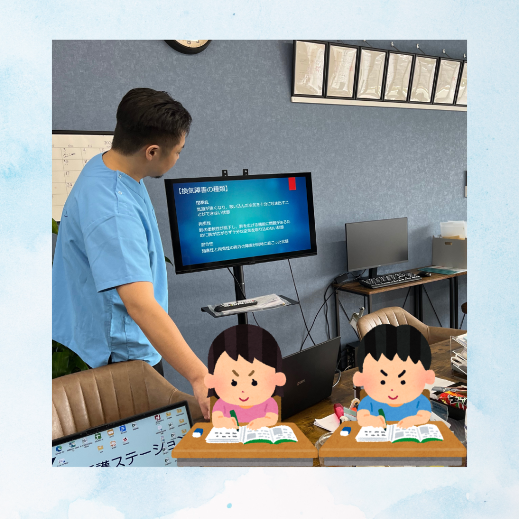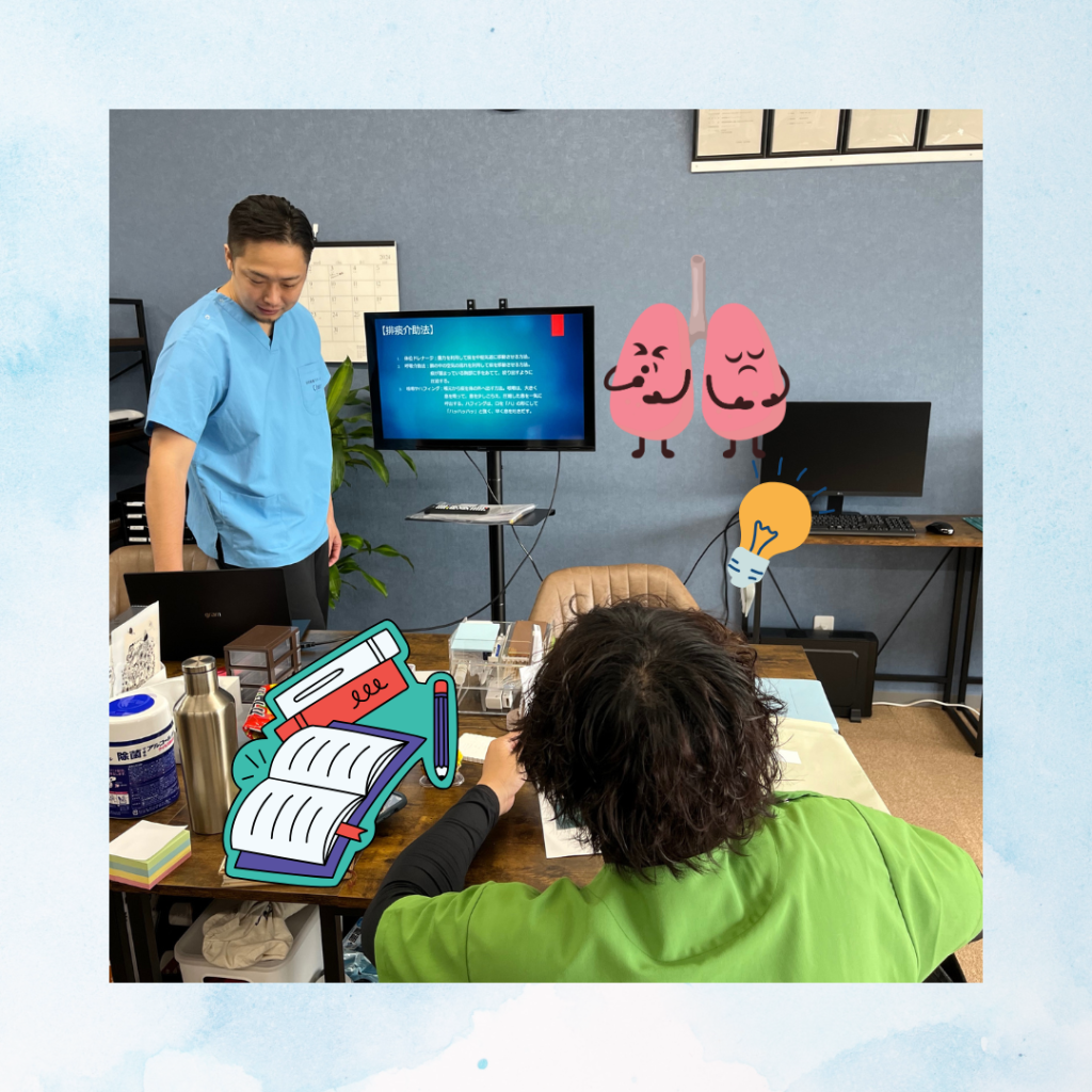 呼吸に関する勉強会 トピックス 2024.10.18 今月は利用者様のご家族より安楽な呼吸の体位や排痰方法についてのご質問が多くあり、職員より勉強会希望があったので、その一部風景です!!少しでもスタッフが自信を持って業務へ従事できるよう、定期的な研修を実施しています。