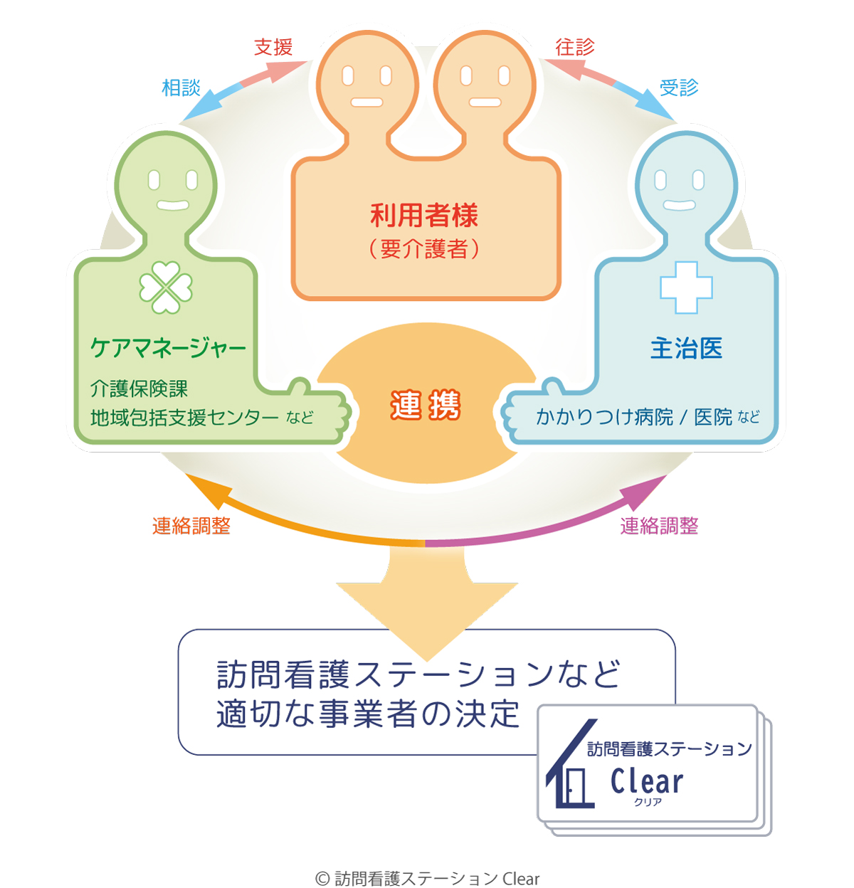 介護支援専門員(いわゆる:ケアマネージャー)が、介護を要する方からの相談を受けて、かかりつけ病院や医院と連携しながら適切な事業者(訪問看護ステーションなど)選定のサポートを行います。