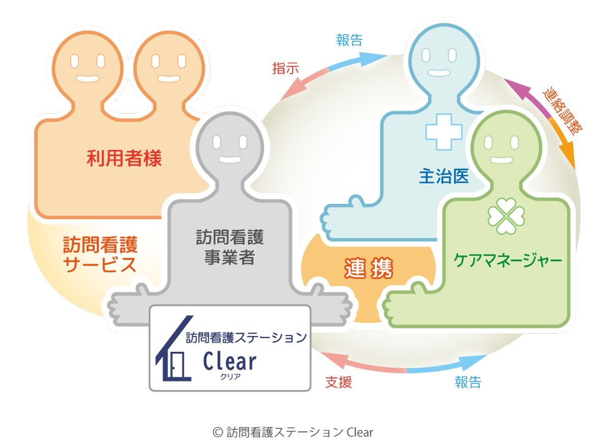 当サイト上の図式、画像、説明などは「訪問看護ステーション Clear」が考案・制作したものです。無断使用・無断掲載/転載は固くお断りします。